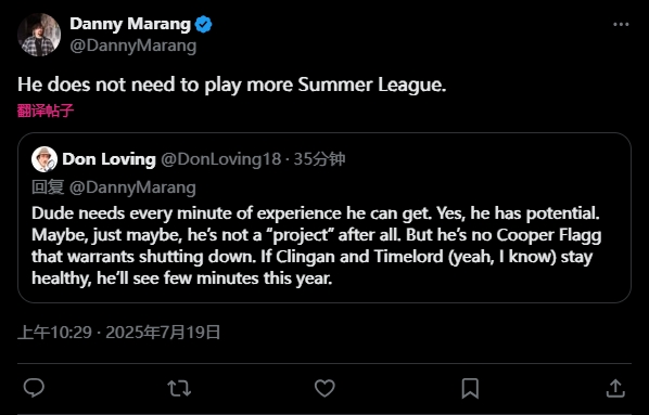开拓者记者Danny Marang维护杨瀚森,表示:“他不需要夏季联赛的经验了。 ”